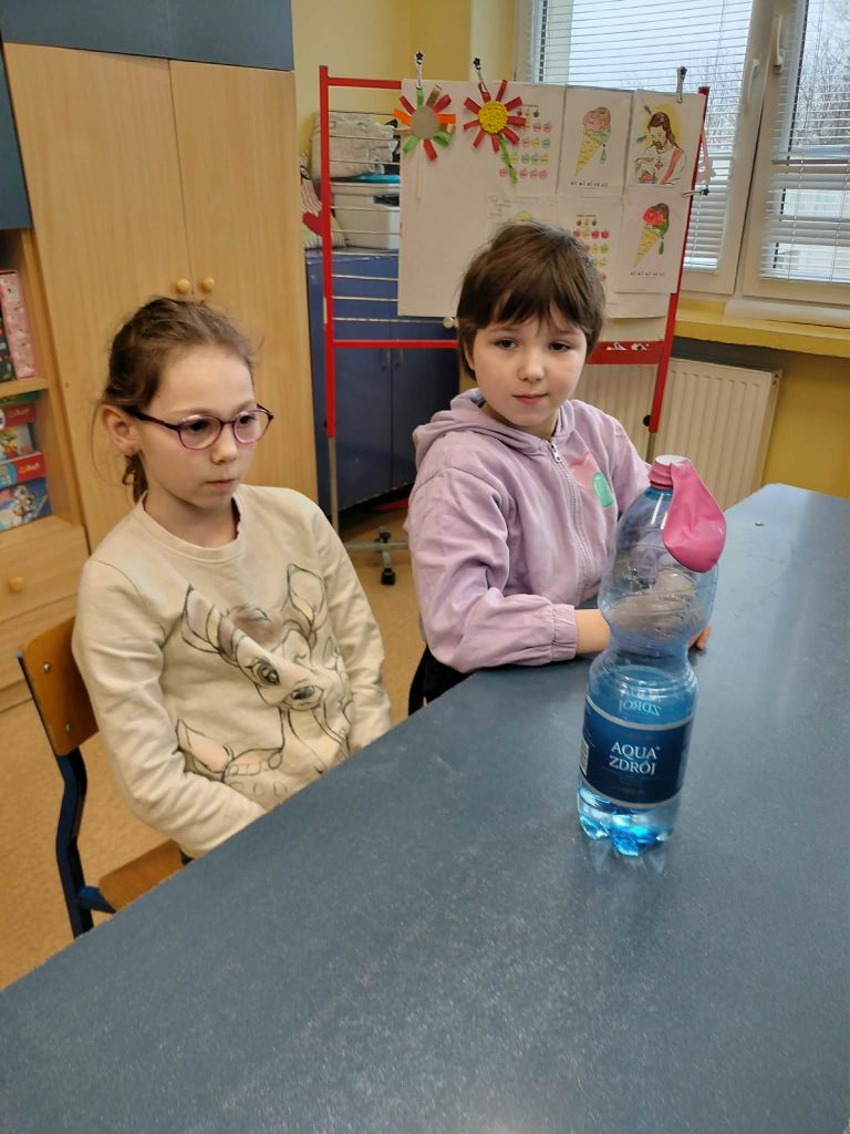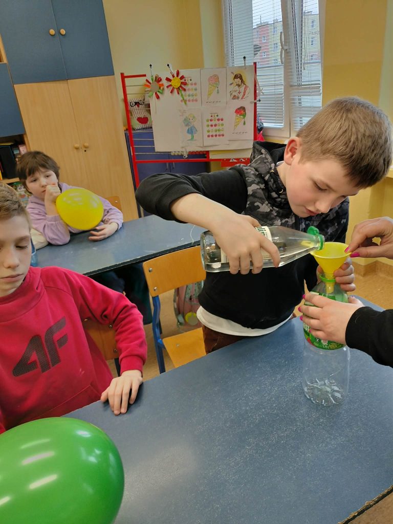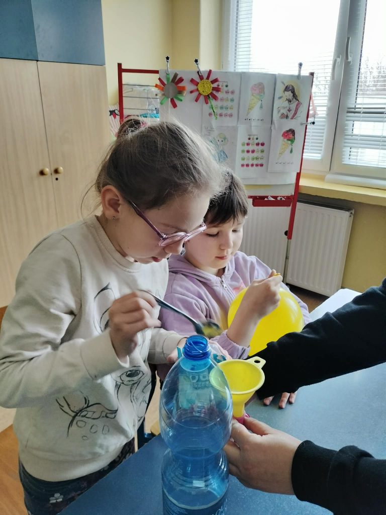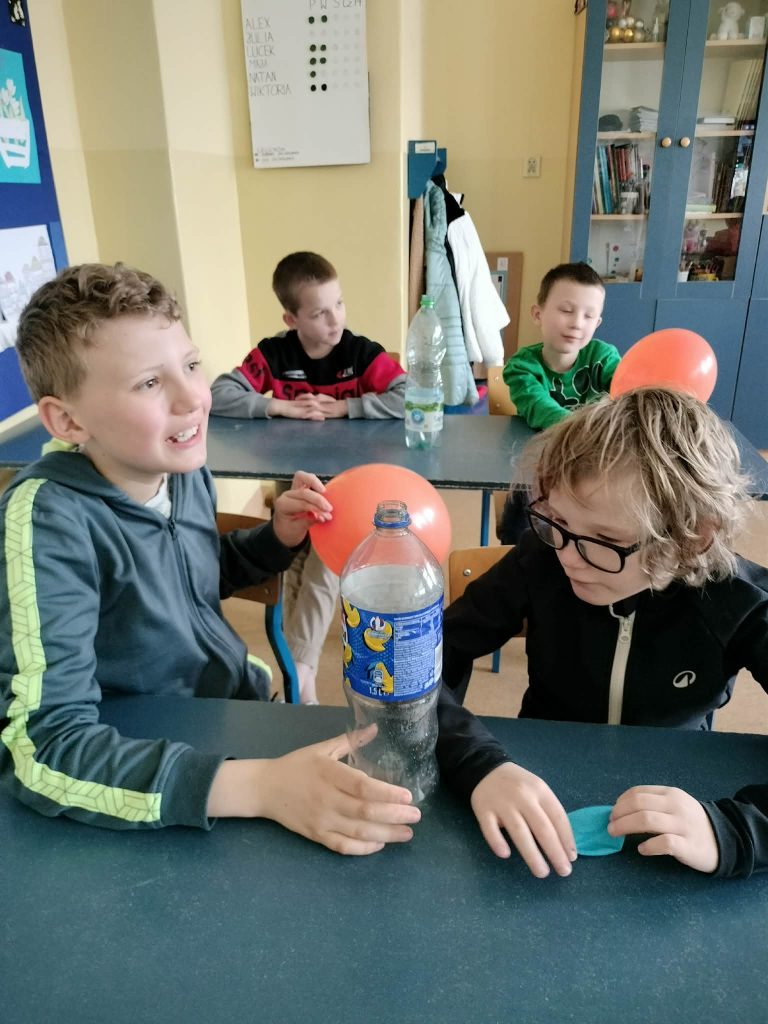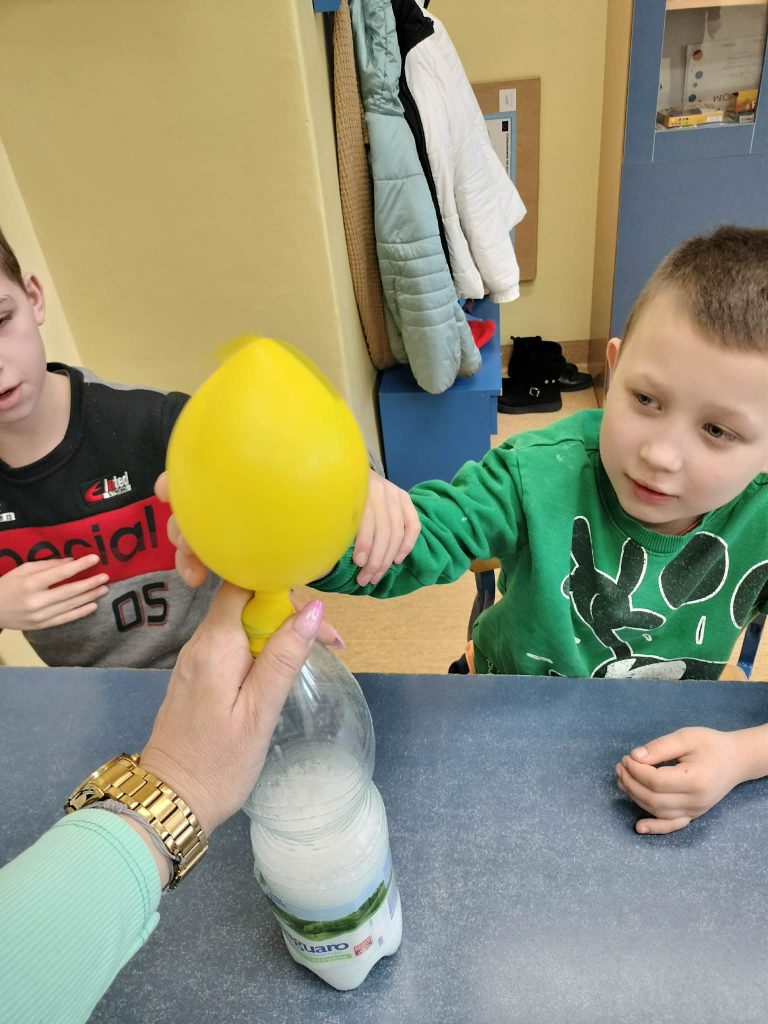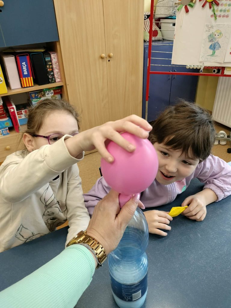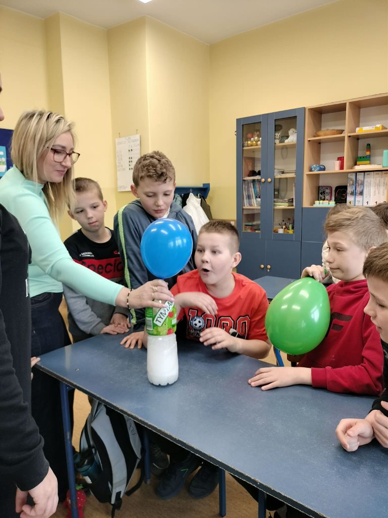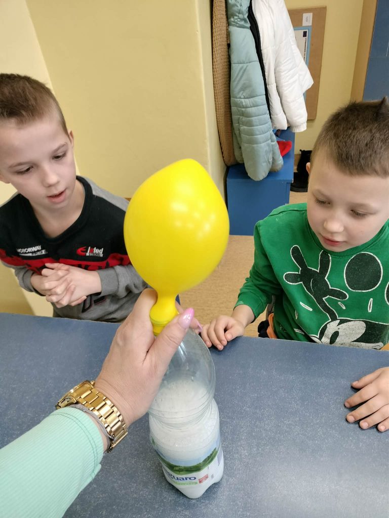 Dzieci starały się zrozumieć powstawanie gazu w reakcji chemicznej, której efektem było pompowanie balona.