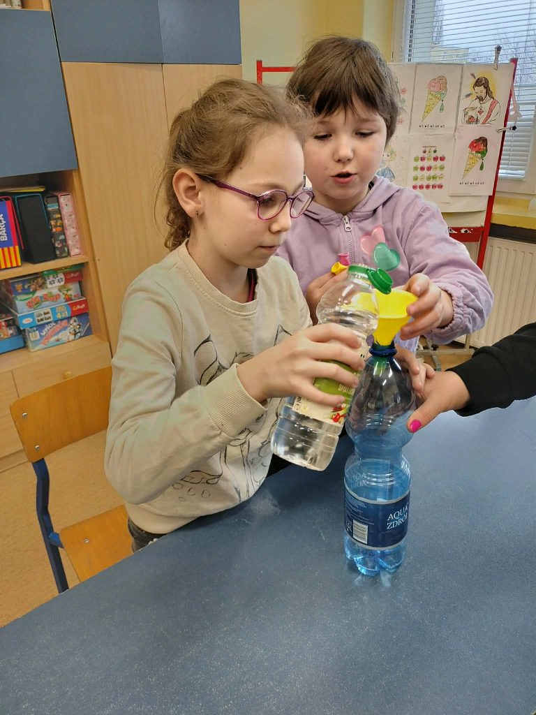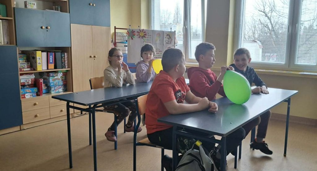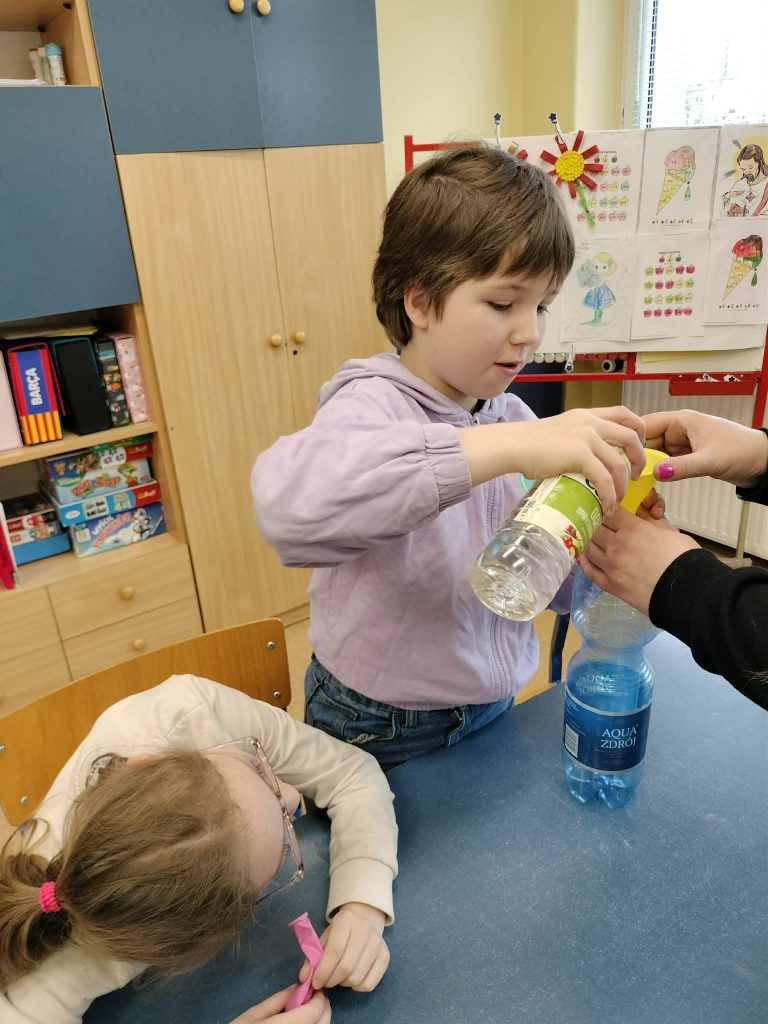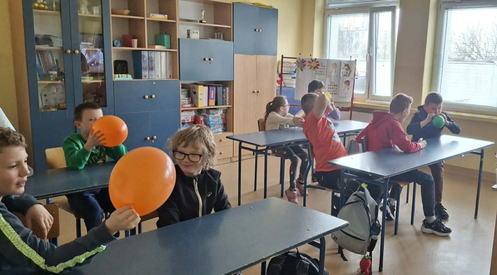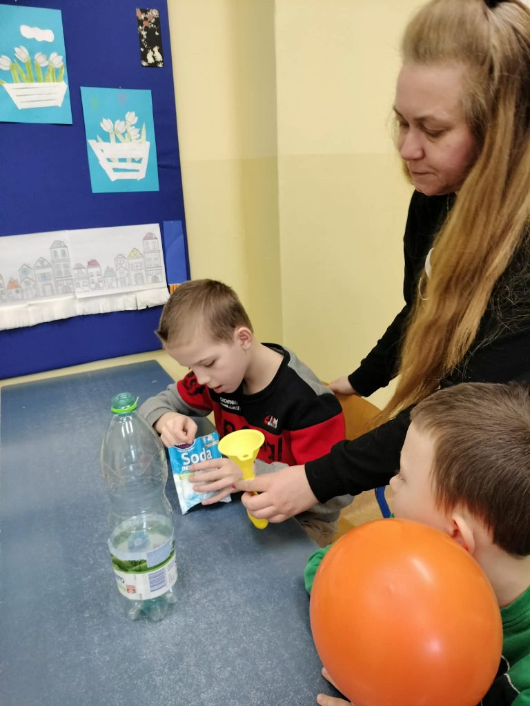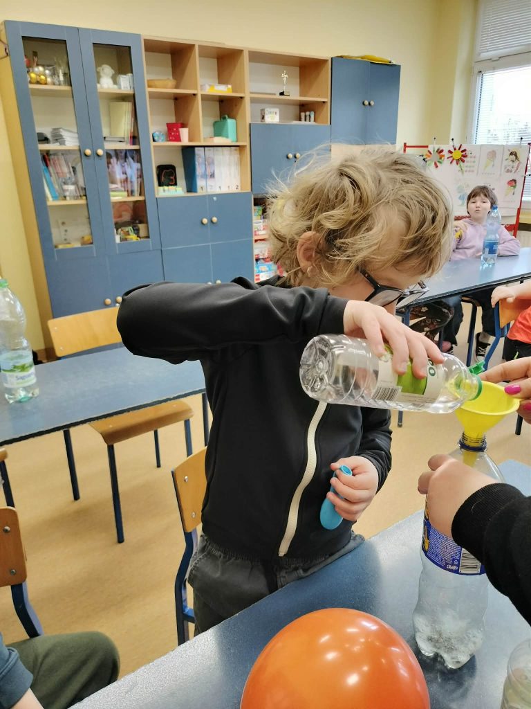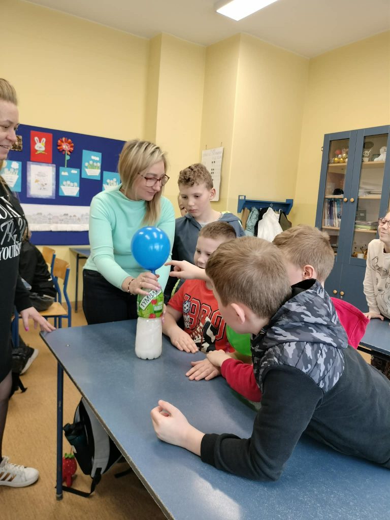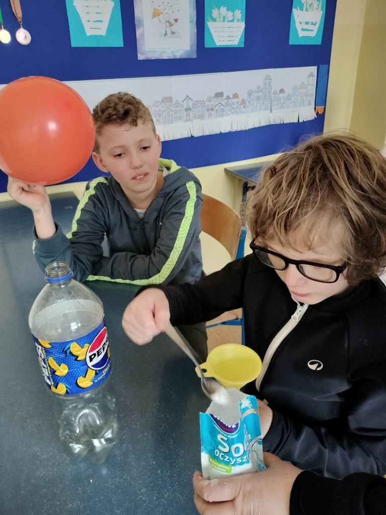 Dzieci starały się zrozumieć powstawanie gazu w reakcji chemicznej, której efektem było pompowanie balona.